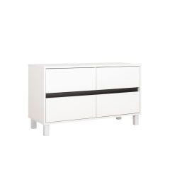 Продуманный функционал, лаконичный дизайн и минималистичность форм являются основными свойствами этой тумбы и позволяют ей отлично вписываться в любой интерьер. Корпус тумбы выполнен из белой плиты, выдвижные ящики графично разделены горизонтальной черной полосой из алюминиевого профиля. В столешнице имеется вырез под провода для удобства подключения мультимедиа техники, а регулируемые опоры легко компенсируют неровности пола.