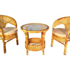 Комплект из натурального ротанга, состоящий из дивана, двух кресел и круглого столика со стеклом.
